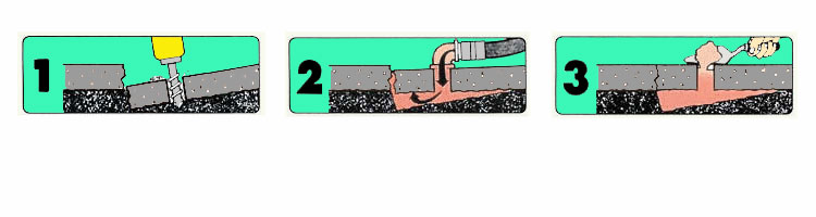 Lifting brackets are installed on the helical shafts to allow placement of hydraulic jacks wich can be used to lift the building foundation. After the home is lifted, we will then pump cement grout beneath the floors to fill any voids created by the lifting procedure and to stabilize the floor slab. This type of pressure grouting (also called mud-jacking) will fill the void, and can also be used to lift the floor slab when required. SEE MUDJACKING INFORMATION BELOW
