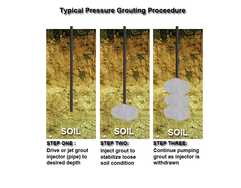 Pressure grouting is the process of pumping cement grout into the soil beneath structures that are experiencing abnormal settlement. Grout is pumped through steel pipe injectors (needles) that have been jetted or driven into the weak soil beneath a building or other structure. The depth of each injection is dictated by the exact soil condition at that location, and by the weight of the structure being supported. Typically, grouting depths vary from 4 feet to 25 feet below the surface. Deeper injections could be required to fill sinkholes or support tall buildings. Grouting depths beneath typical homes normally do not exceed 15 feet. The pressure at which the grout is injected also depends on the soil and the weight of the structure, and is between 50 psi and 500 psi.